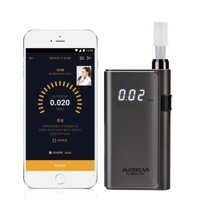 스마트폰 어플리케이션 ALCOSCAN 과 연결하여 언제, 어디서, 누가 측정했는지 안전관리자에게 보고할 수 있도록 설계된 음주측정기 입니다.