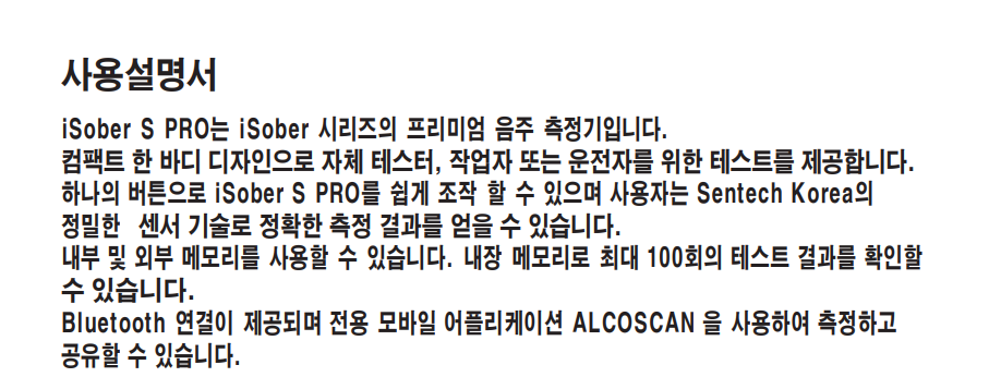 | 추가기능 | - 교정 시기 안내. - 테스트 결과 100회 저장 기능 - 외장 SD카드 삽입 가능 - 옵션 : 블루투스 BLE 방식으로 ALCOSCAN 어플리케이션과 연동 - 무선 인증서 : CE RED, FCC, Bluetooth SIG |